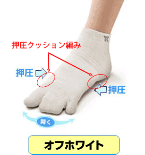 ●親指の付け根と小指の外側部分を押圧するパイルクッションが編みこまれ、足裏のアーチを更にサポート。